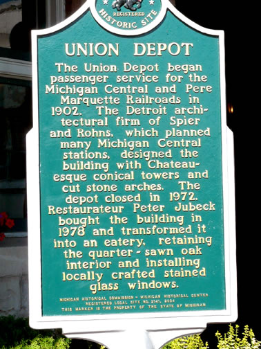 The Union Depot began passenger service for the Michigan Central and Pere Marquette Railroads in 1902. The Detroit architectural firm of Spier and Rohns, which planned many Michigan Central stations, designed the building with Chateauesque conical towers and cut stone arches.