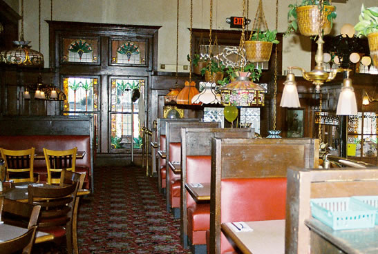 This photo shows more of the Tiffany Lamps and stained glass windows.